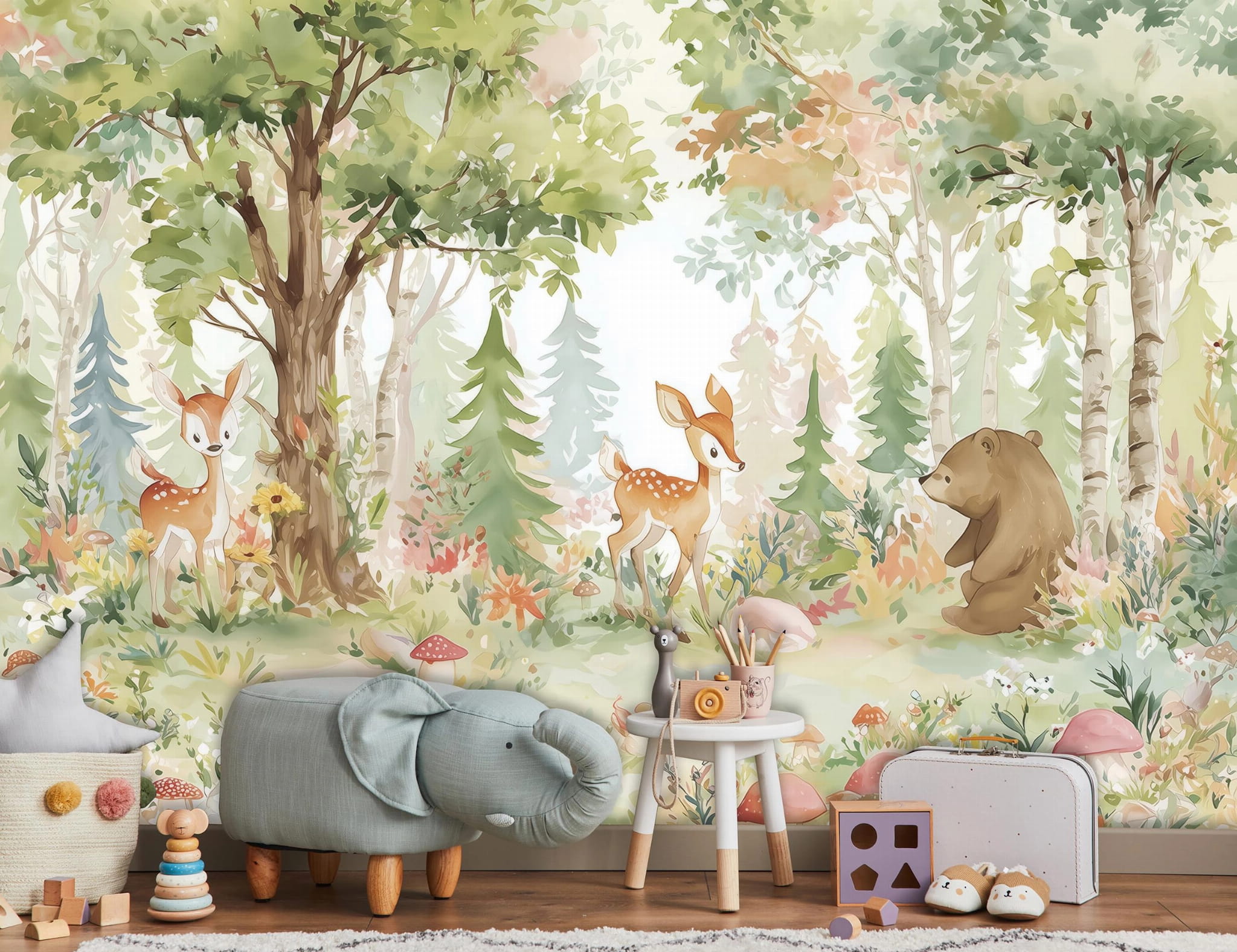 Fototapeta las zielony brązowy z sarnami liskiem i niedźwiadkami